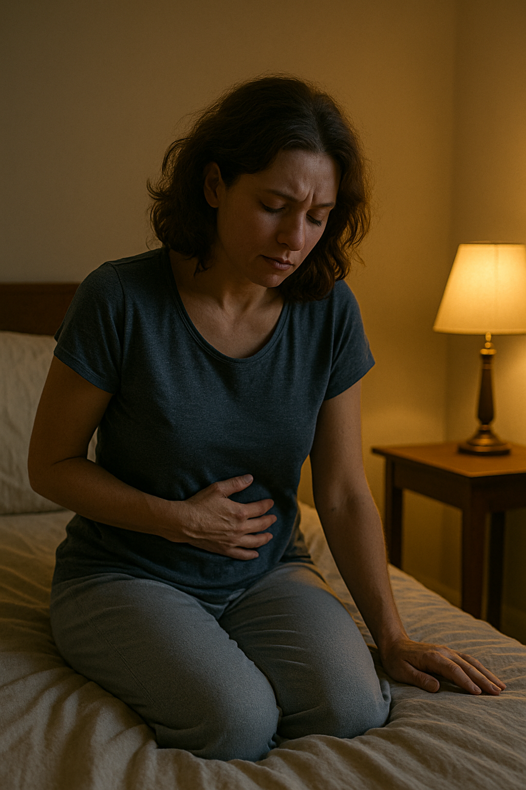 Routine B: Right-Rib Relax (7 minutes, evenings) Steps: Sit upright. Inhale 4, exhale 6, five times. Gentle side-bend to the left to open the right rib cage; hold 20-30 seconds, twice. Finish with a hand-on-abdomen breath. Timing suggestion: Right after the plate-closing ritual before you dim to the single lamp.