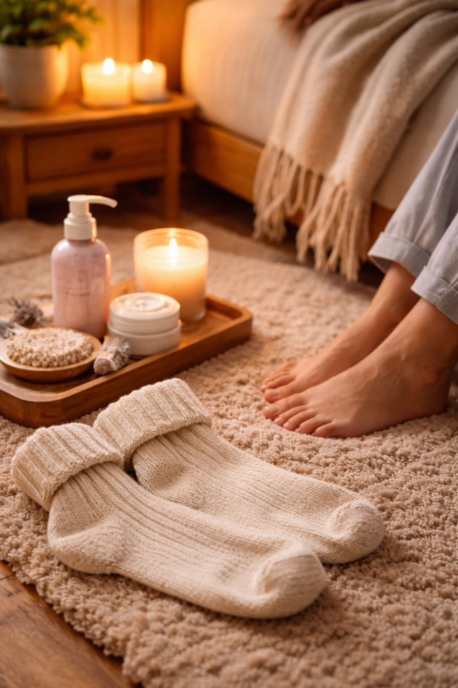 Warm feet before bed. Socks, a heating pad, or a warm soak help improve circulation, often easing nighttime nerve sensations.
